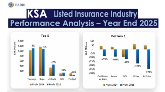 Source: BADRI - KSA's top 5 and bottom 5 insurers in terms of net results in 2025